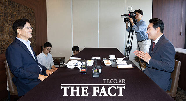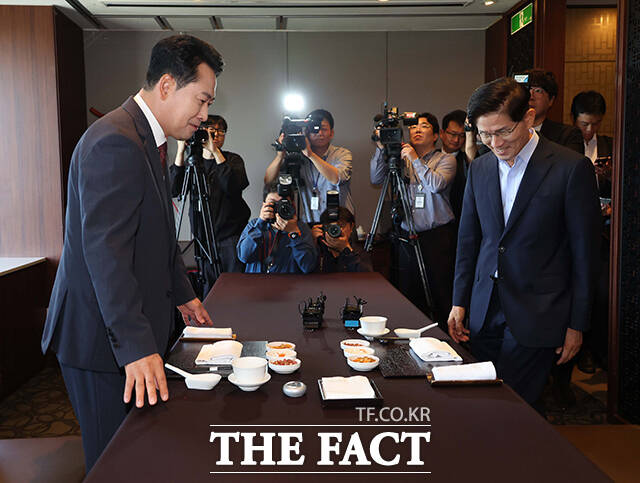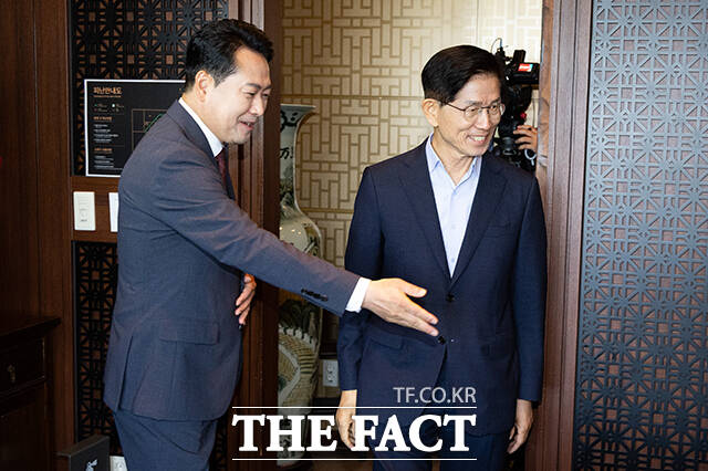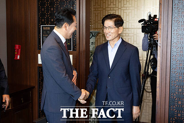 [더팩트ㅣ국회=배정한 기자] 장동혁 국민의힘 대표와 김문수 전 고용노동부 장관(왼쪽)이 23일 서울 여의도 한 중식당에서 만나 오찬에 앞서 대화를 하고 있다.