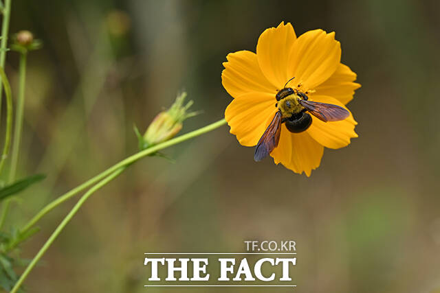 [더팩트ㅣ장윤석 기자] 절기상 추분인 23일 오후 서울 용산구 노들섬 공원에 핀 황화코스모스 위로 호박벌이 꿀을 따고 있다.