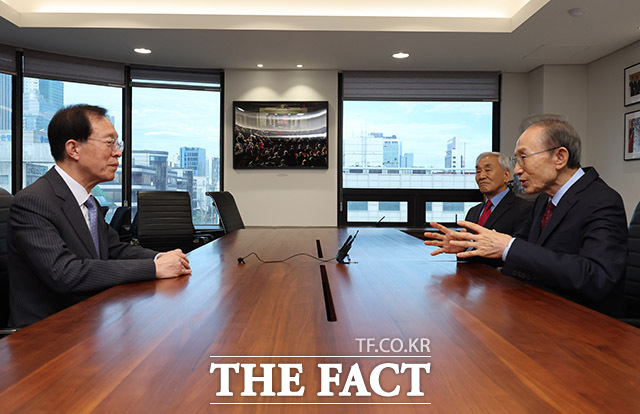 [더팩트ㅣ남용희 기자] 이석연 국민통합위원장(왼쪽)이 23일 오후 서울 서초구 청계재단을 찾아 이명박 전 대통령과 대화를 나누고 있다.