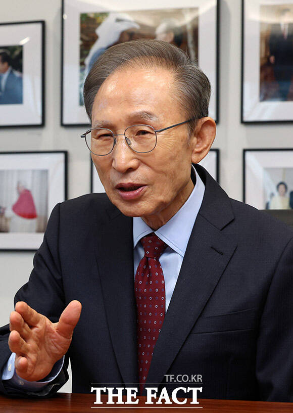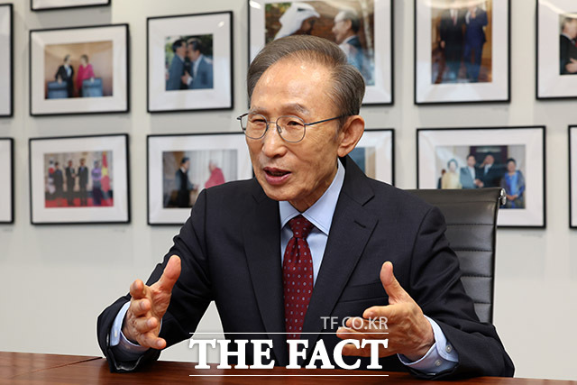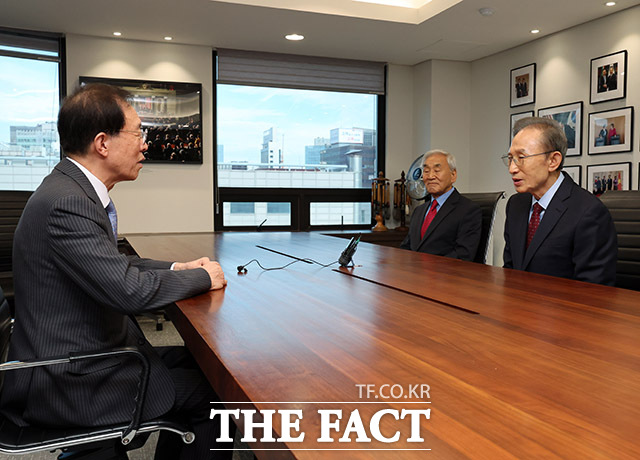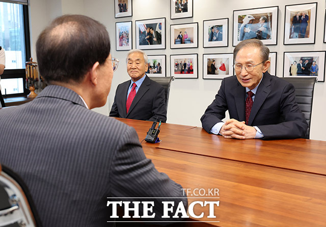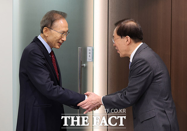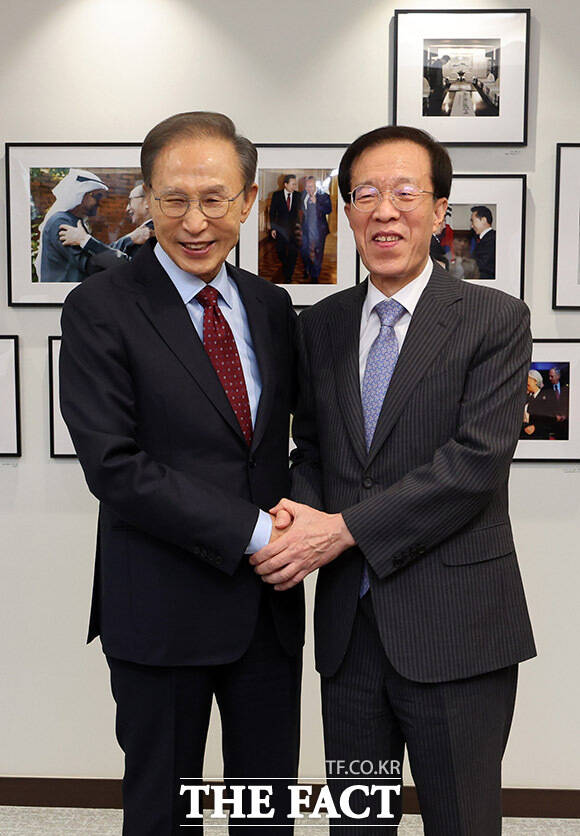 [더팩트ㅣ남용희 기자] 이명박 전 대통령(왼쪽)과 이석연 국민통합위원장이 23일 오후 서울 서초구 청계재단에서 기념촬영을 하고 있다.