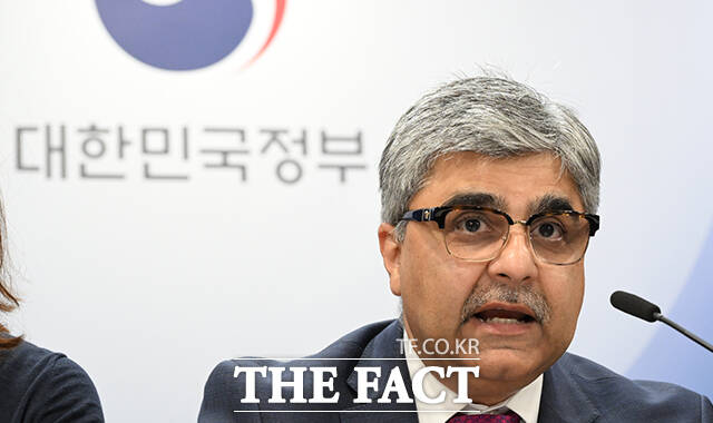 [더팩트ㅣ임영무 기자] 라훌 아난드 IMF 한국미션단장이 24일 오전 서울 종로구 정부서울청사에서 2025 연례협의 개최 결과를 발표하고 있다.