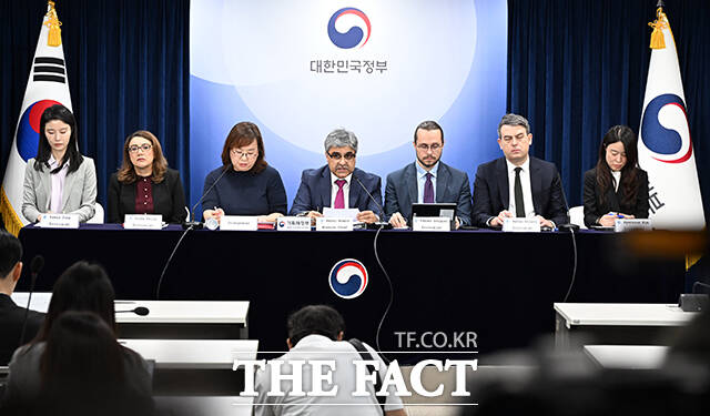[더팩트ㅣ임영무 기자] 라훌 아난드 IMF 한국미션단장(가운데)이 24일 오전 서울 종로구 정부서울청사에서 연례협의 결과를 발표하고 있다.