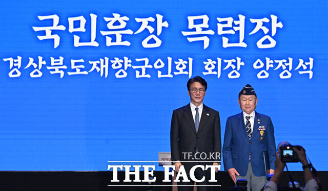 김민석 국무총리(왼쪽)가 24일 서울 송파구 올림픽로 올림픽공원 올림픽홀에서 열린 제73주년 재향군인의 날 기념식에 참석해 양정석 경상북도재향군인회회장에게 국민훈장 목련장을 수여하고 있다.