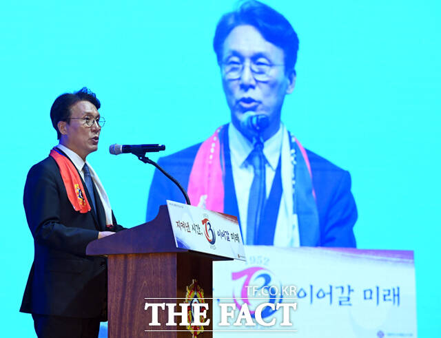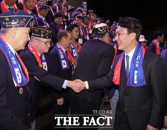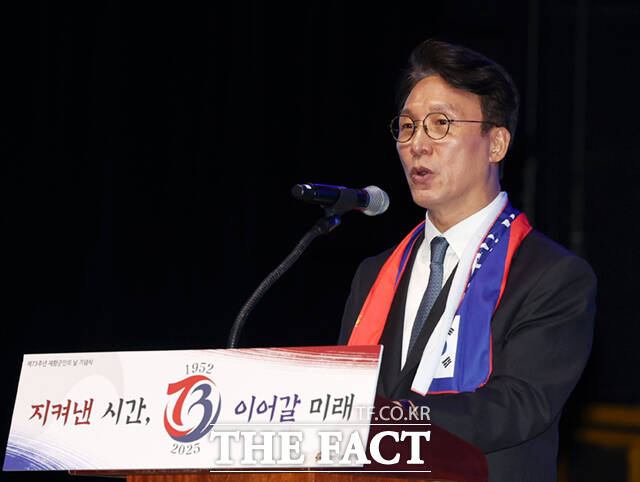 [더팩트ㅣ이새롬 기자] 김민석 국무총리가 24일 서울 송파구 올림픽로 올림픽공원 올림픽홀에서 열린 제73주년 재향군인의 날 기념식에 참석해 축사를 하고 있다.