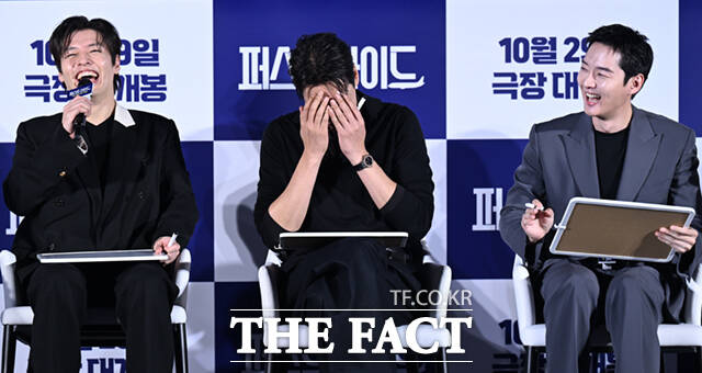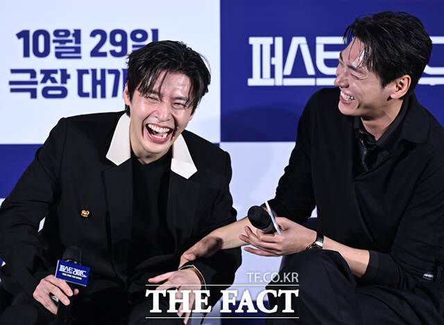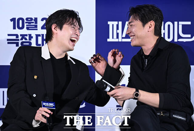 [더팩트ㅣ이새롬 기자] 배우 강하늘(왼쪽)과 김영광이 25일 서울 용산구 CGV 용산 아이파크몰에서 열린 영화 '퍼스트 라이드'의 제작보고회에 참석해 웃음을 터뜨리고 있다.