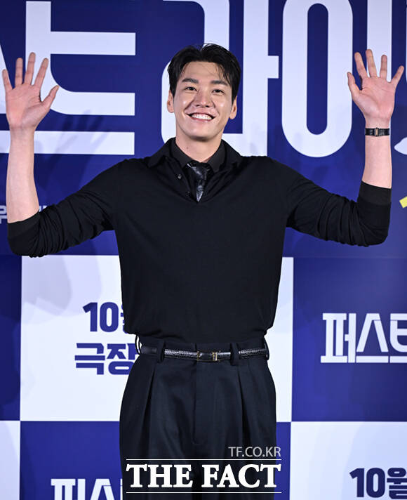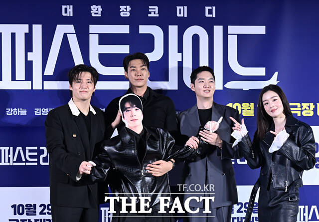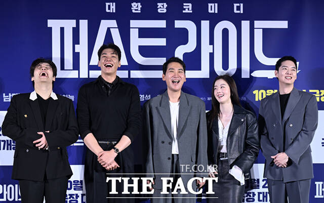 [더팩트ㅣ이새롬 기자] 25일 서울 용산구 CGV 용산 아이파크몰에서 영화 '퍼스트 라이드'의 제작보고회가 열린 가운데, 출연 배우들이 포즈를 취하고 있다.