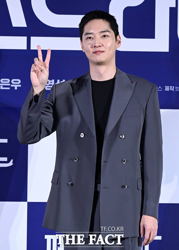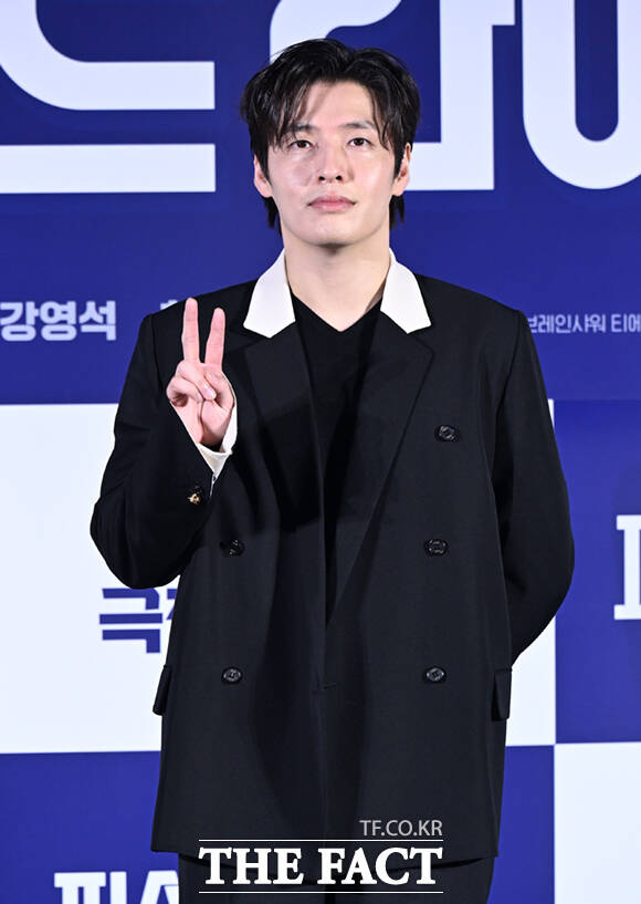 배우 김영광이 25일 서울 용산구 CGV 용산 아이파크몰에서 열린 영화 퍼스트 라이드의 제작보고회에서 군입대로 참석하지 못한 차은우 대신 인형과 포즈를 취하고 있다.