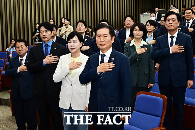 정 대표는 이날 의원총회에서 "새 정부가 새로운 정부조직법에 맞춰 대한민국의 5년을 준비하려 하는데, 이재명 정부의 정부조직법을 발목 잡고 있는 세력이 있다"고 말했다.