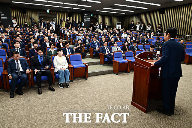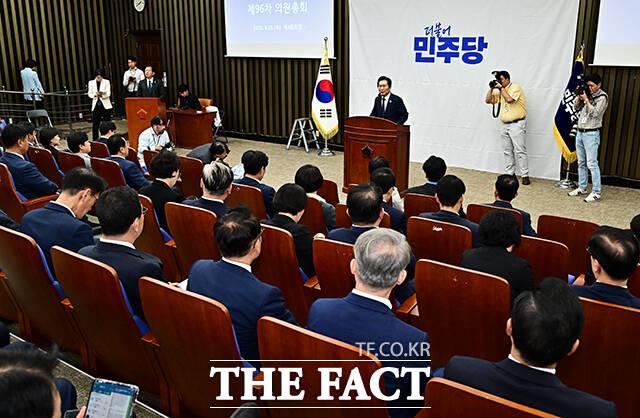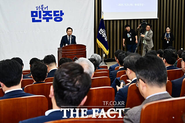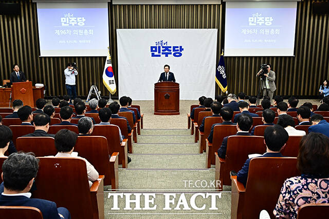 [더팩트ㅣ국회=배정한 기자] 정청래 더불어민주당 대표가 25일 오후 서울 여의도 국회에서 열린 의원총회에 참석해 모두발언을 하고 있다.
