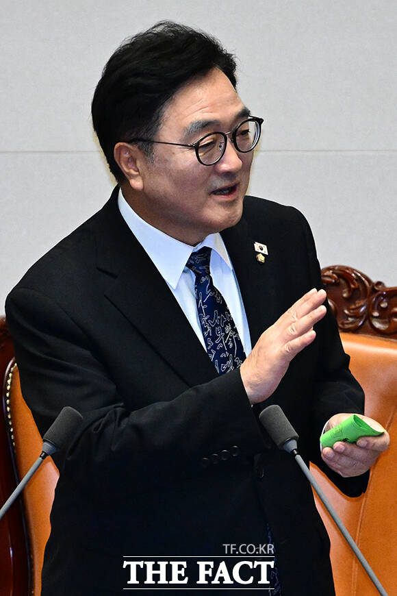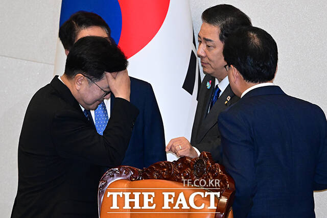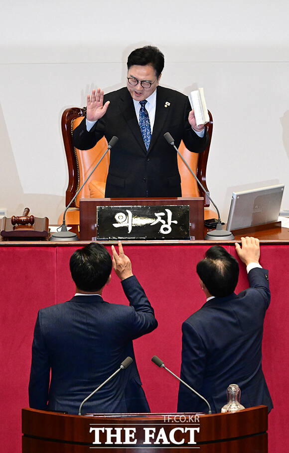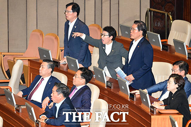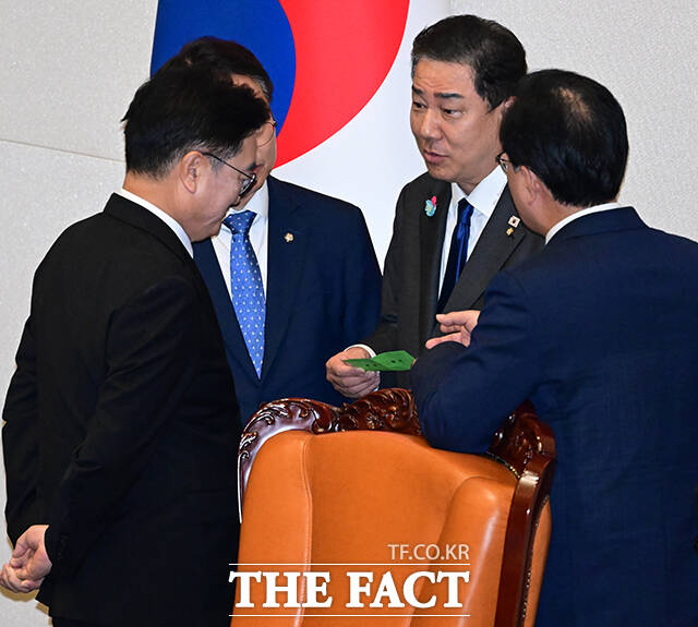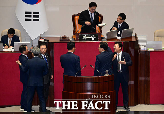 [더팩트ㅣ국회=남윤호 기자] 25일 오후 서울 여의도 국회에서 열린 본회의에서 우원식 국회의장과 김병기 더불어민주당 원내대표, 송언석 국민의힘 원내대표가 무기명 투표에서 나온 모호한 표를 두고 처리 방안을 논의하고 있다.
