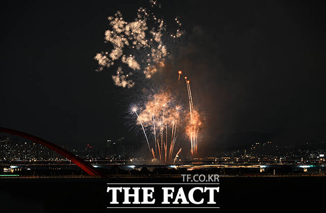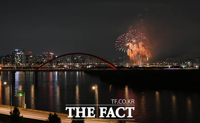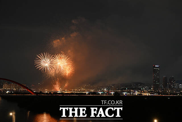[더팩트ㅣ박헌우 기자] '2025 서울세계불꽃축제'가 27일 오후 서울 여의도 일대에서 열린 가운데 서울 마포구 마포365구민센터에서 바라본 불꽃이 서울 밤하늘을 수놓고 있다.