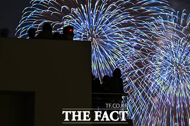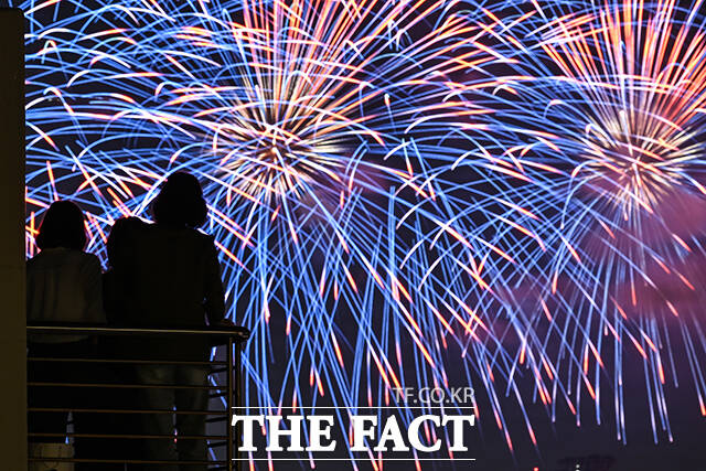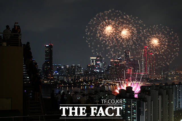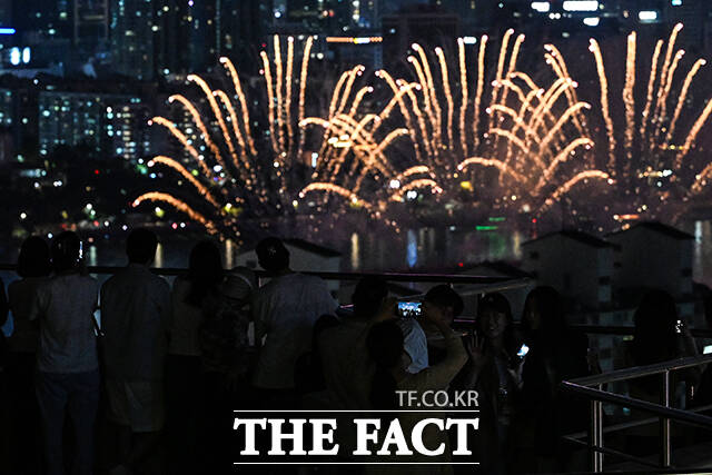 [더팩트ㅣ서예원 기자] '2025 서울세계불꽃축제'가 27일 오후 서울 여의도 한강공원에서 열린 가운데 시민들이 가을 밤하늘을 수놓은 불꽃을 바라보고 있다.