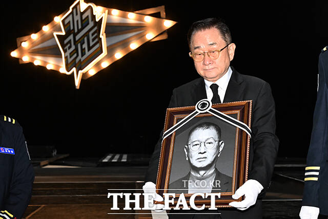 [더팩트ㅣ서예원 기자] 고(故) 전유성의 노제가 28일 오전 서울 영등포구 여의도 KBS 개그콘서트 녹화 세트장에서 열린 가운데 고인의 영정이 운구되고 있다.