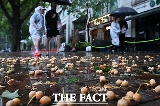 [더팩트ㅣ서예원 기자] 전국이 대체로 흐리고 비가 내리는 28일 오전 서울 영등포구 일대의 우산을 쓴 시민들이 바닥에 떨어져 있는 은행 열매들을 피해 발걸음을 옮기고 있다.