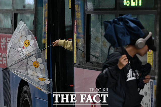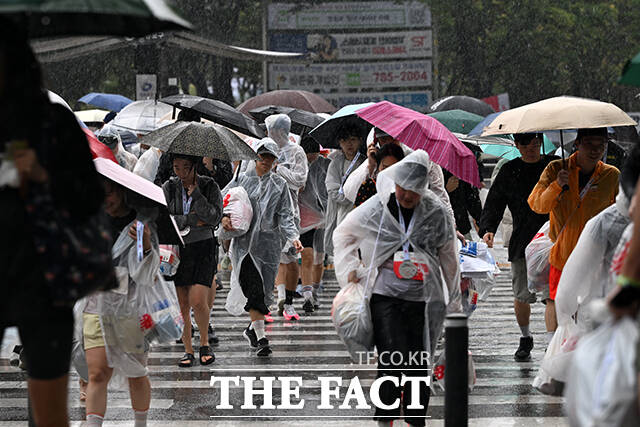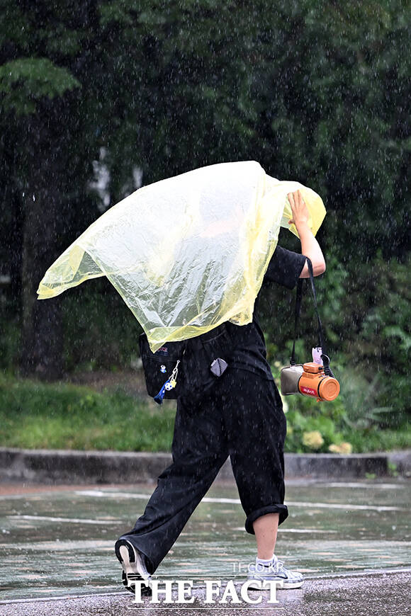 [더팩트ㅣ서예원 기자] 전국이 대체로 흐리고 비가 내리는 28일 오전 서울 영등포구 일대의 시민들이 우비를 뒤집어 쓰고 발걸음을 옮기고 있다.