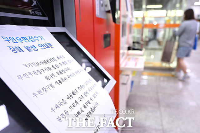[더팩트ㅣ남용희 기자] 국가정보자원관리원 대전 본원 전산실 화재로 전산망 마비 사태가 이어지고 있는 29일 오전 서울 종로구 광화문우체국 내 무인우편접수기에 장애 안내 발생 안내문이 붙어있다.