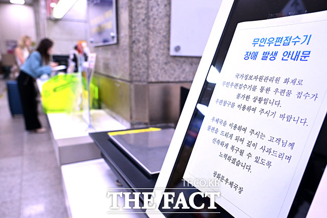 [더팩트ㅣ남용희 기자] 국가정보자원관리원 대전 본원 전산실 화재로 전산망 마비 사태가 이어지고 있는 29일 오전 서울 종로구 광화문우체국을 찾은 한 시민이 금융업무를 보고 있다.