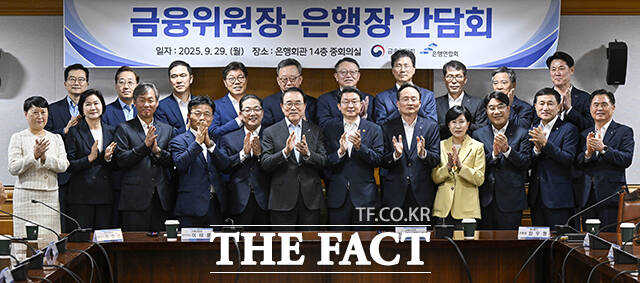 [더팩트ㅣ임영무 기자] 이억원 금융위원장(오른쪽 여섯 번째)이 29일 오후 서울 중구 은행회관에서 열린 금융위원장-은행장 간담회에 참석해 조용병 은행연합회장 등 20개 은행 은행장들과 기념촬영을 하고 있다.darkroom@tf.co.kr사진영상기획부 photo@tf.co.kr