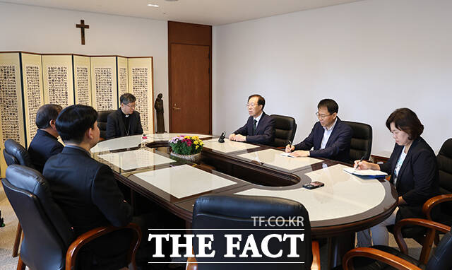 [더팩트ㅣ임영무 기자] 이석연 국민통합위원장이 29일 오전 서울 명동 천주교 서울대교구를 찾아 정순택 대주교를 예방하고 있다.