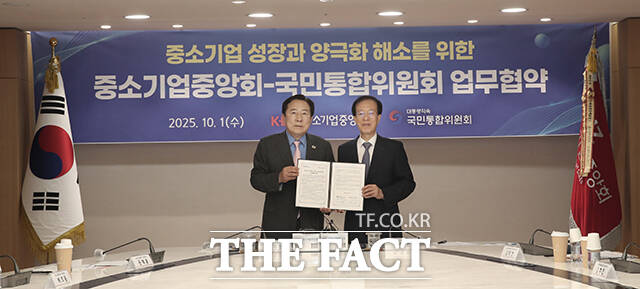 [더팩트ㅣ임영무 기자] 이석연 국민통합위원장(오른쪽)이 1일 오전 서울 여의도 중소기업중앙회에서 '중소기업 성장과 양극화 해소를 위한 업무협약'을 마친 뒤 김기문 중기중앙회장과 기념촬영을 하고 있다.