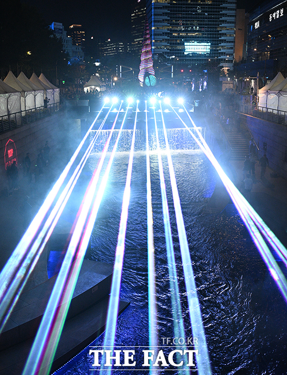[더팩트ㅣ박헌우 기자] 1일 오후 서울 중구 청계광장에서 '청계천 복원 20주년 행사'가 열린 가운데 레이저 아트가 펼쳐지고 있다.