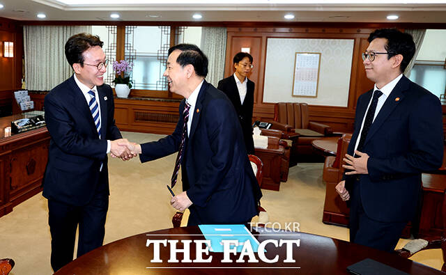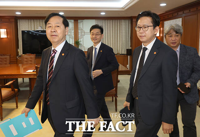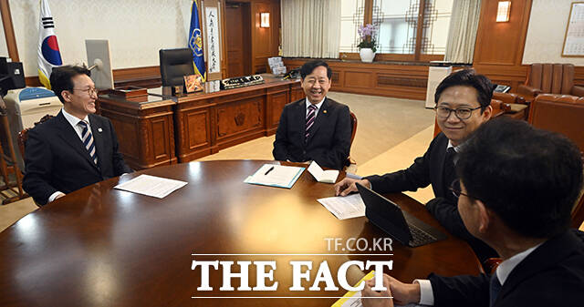 [더팩트ㅣ임영무 기자] 김민석 국무총리가 2일 오전 서울 종로구 정부서울청사 집무실에서 구윤철 부총리 겸 기획재정부 장관과 배경훈 과기부총리 겸 과학기술정보통신부 장관, 윤창렬 국무조정실장이 참석한 '제1회 3+알파(α) 회의'를 주재하고 있다.