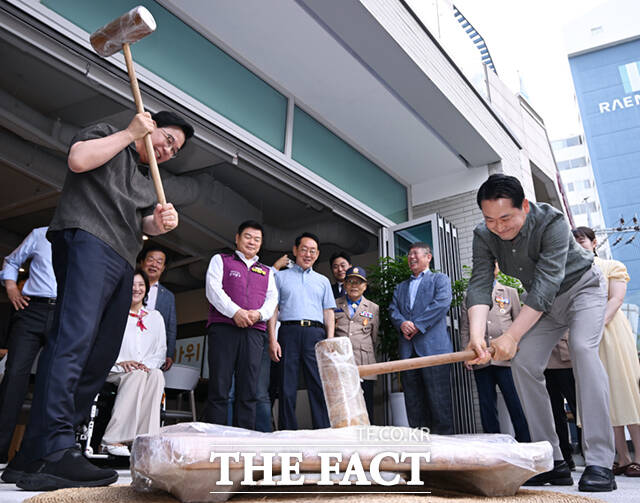장동혁 국민의힘 대표(오른쪽)와 송언석 원내대표가 추석 연휴를 하루 앞둔 2일 서울 동대문구 전농로 동백꽃노인종합복지관을 찾아 송편 빚기에 앞서 떡메를 치고 있다.