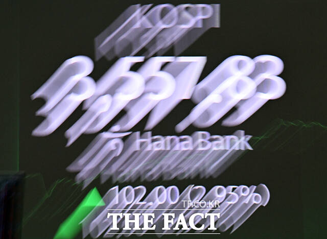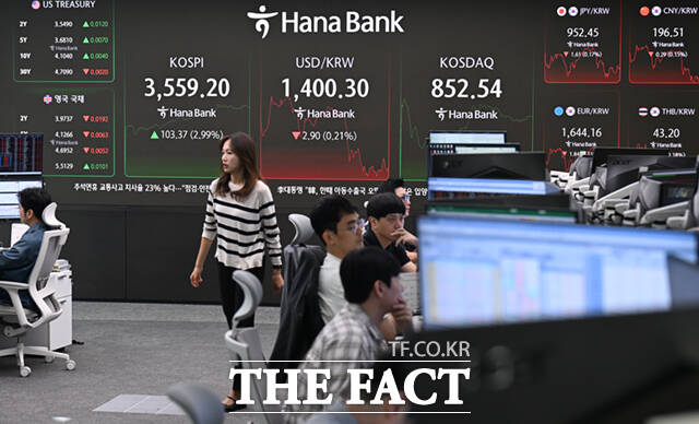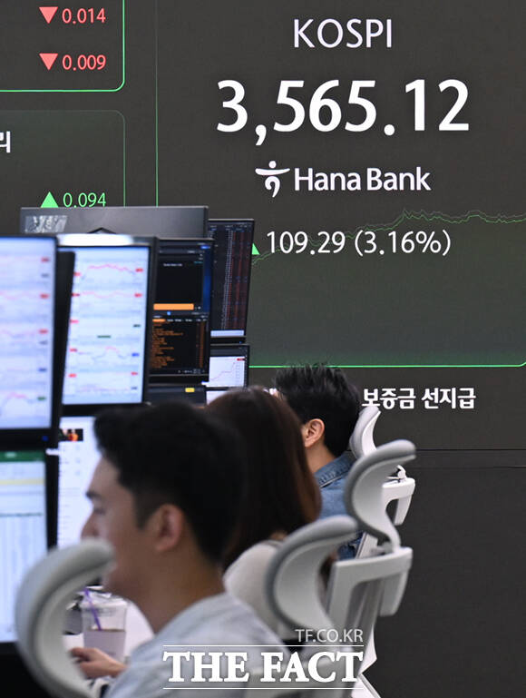 [더팩트ㅣ이새롬 기자] 코스피가 사상 처음으로 3500선을 돌파한 2일 서울 중구 하나은행 본점 딜링룸 전광판에 코스피 지수가 나타나고 있다.