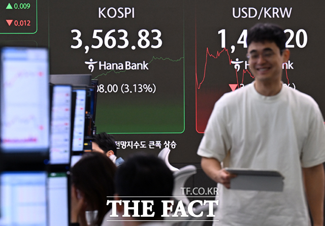 [더팩트ㅣ이새롬 기자] 코스피가 사상 처음으로 3500선을 돌파한 2일 서울 중구 하나은행 본점 딜링룸 전광판에 코스피 지수가 나타나고 있다.