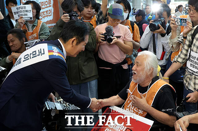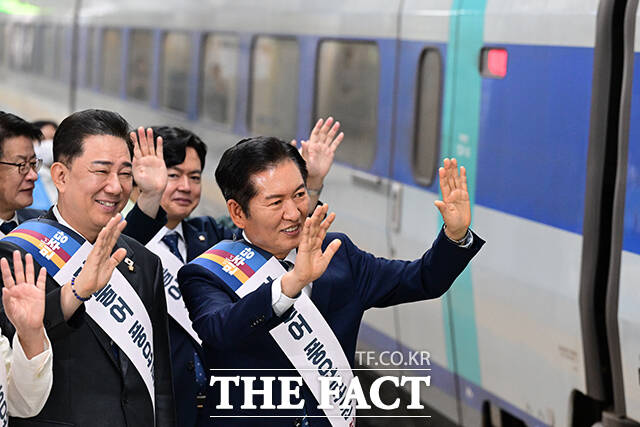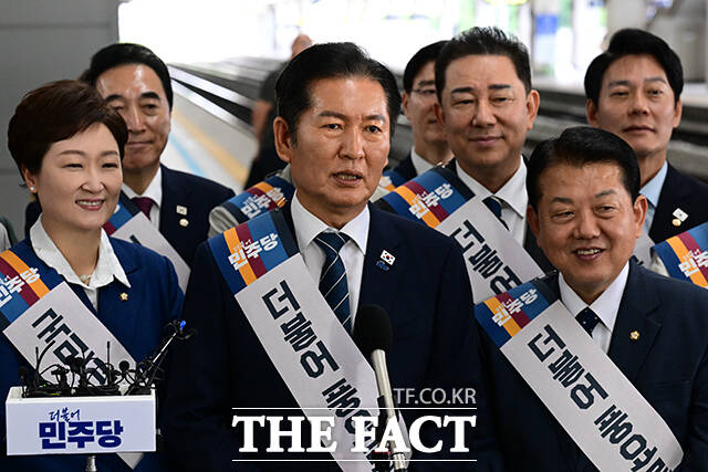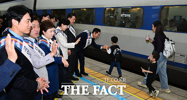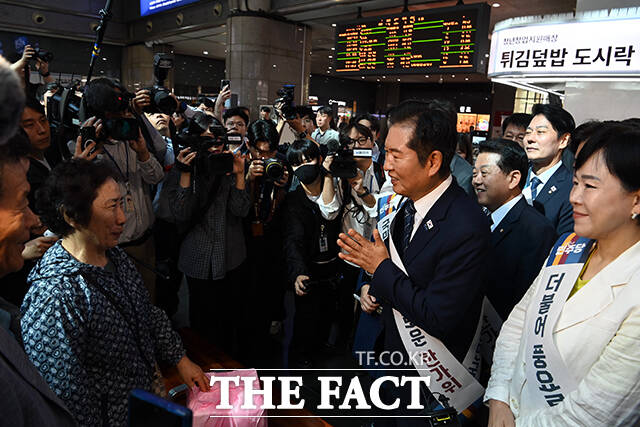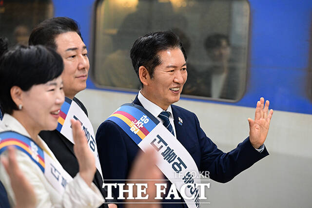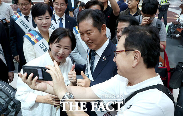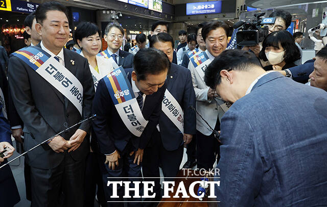 [더팩트ㅣ남윤호 기자] 정청래 더불어민주당 대표 및 지도부가 2일 오전 용산역을 찾아 귀성길에 나선 시민들에게 인사하고 있다.