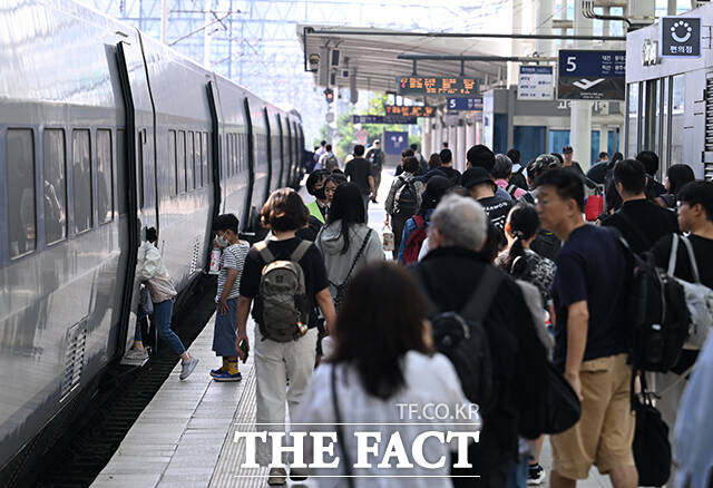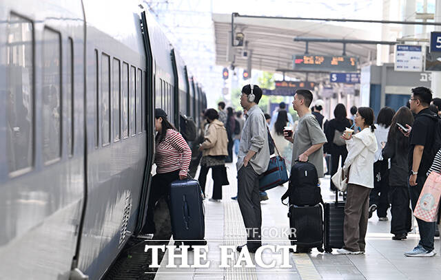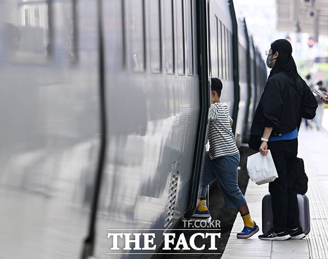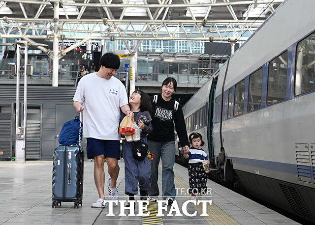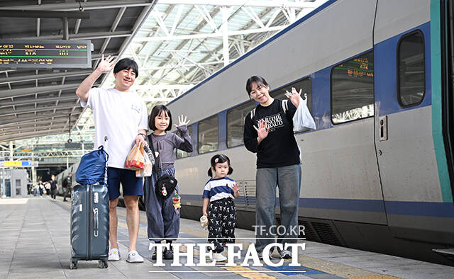 [더팩트ㅣ박헌우 기자] 추석 연휴를 하루 앞둔 2일 오전 서울 용산구 서울역에서 귀성길에 오르는 가족들이 손을 흔들고 있다.