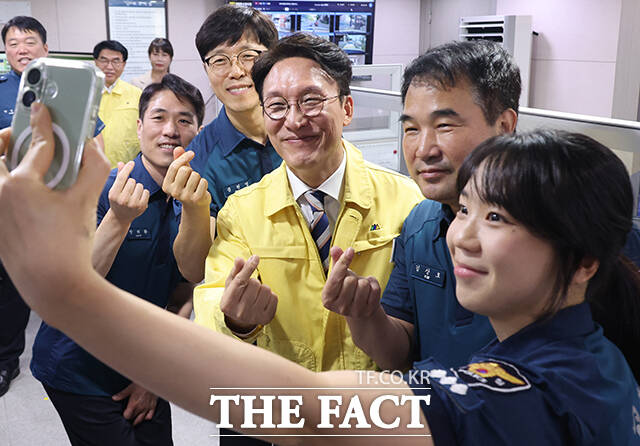 [더팩트ㅣ임영무 기자] 김민석 국무총리(가운데)가 추석연휴를 하루 앞둔 2일 오전 서울 종로구 서울경찰청 112 종합상황실을 방문해 직원들과 함께 기념사진을 찍고 있다.