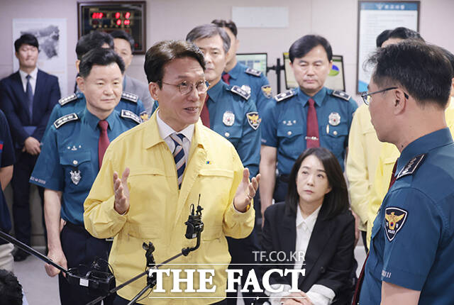 [더팩트ㅣ임영무 기자] 김민석 국무총리가 추석연휴를 하루 앞둔 2일 오전 서울 종로구 서울경찰청 112 종합상황실을 방문해 무전을 통해 현장 근무자들을 격려하고 있다.