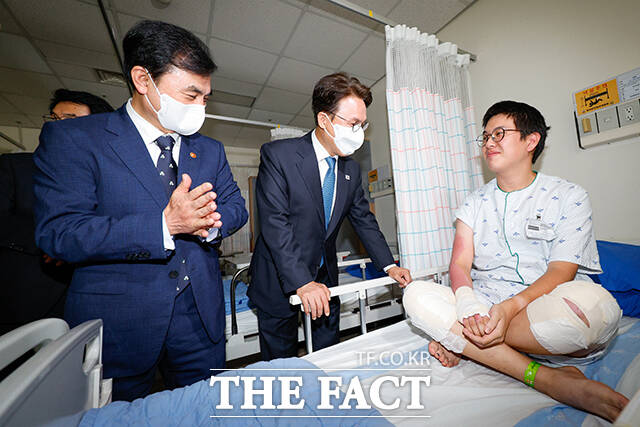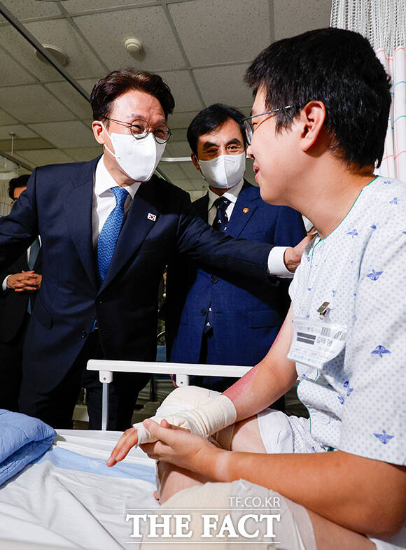 이날 김 총리는 안규백 국방부 장관과 함께 9월 훈련 중 모의탄 폭발로 중환자실에 입원중인 장병을 위문했다. 이어 일반병동에 입원중인 장병과 가족들을 위로하고 병원 관계자들을 격려했다.