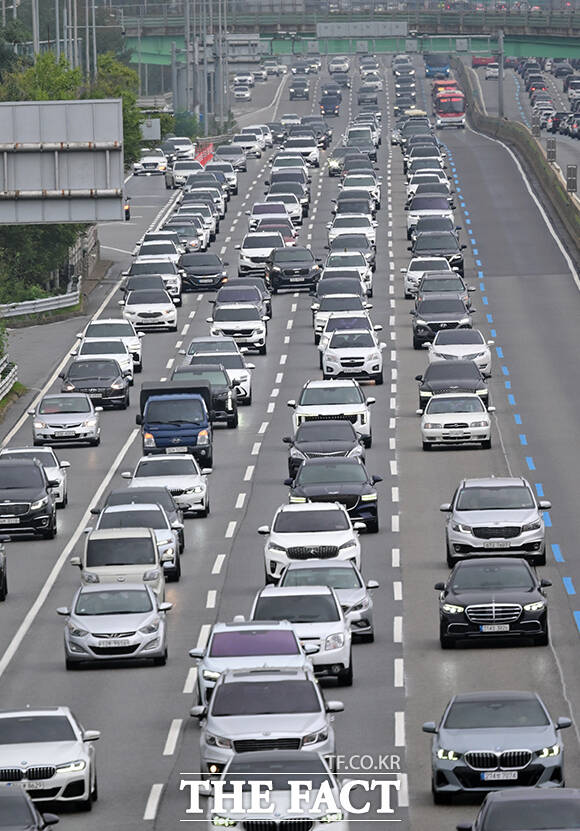 [더팩트ㅣ용인=임영무 기자] 추석 명절 하루전인 5일 오후 경기도 용인 기흥 경부고속도로 부산 방향으로 차량이 늘어나고 있다.