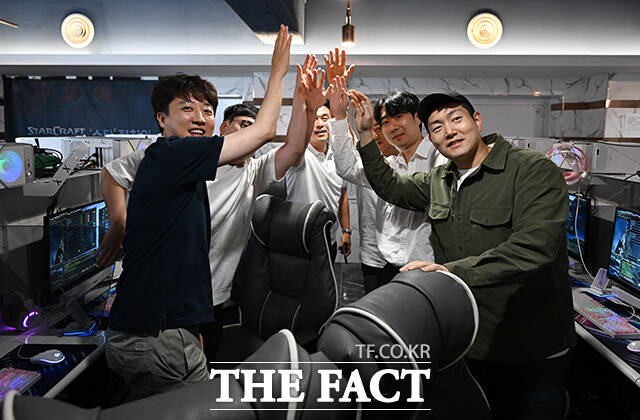 [더팩트ㅣ임영무 기자] 이준석 개혁신당 대표(가운데)와 김재섭 국민의힘 의원이 추석 명절을 하루 앞둔 5일 오후 서울 영등포구의 한 PC방에서 열린 한가위 기념 스타크래프트 게임대회 '스타 정치인'에 참가해 파이팅을 외치고 있다.