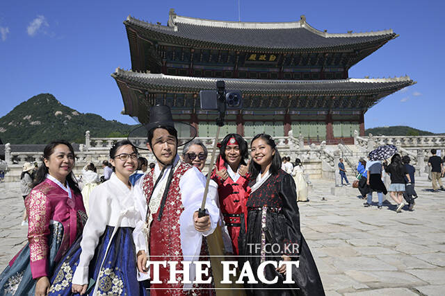 [더팩트ㅣ장윤석 기자] 추석 연휴 엿새째인 8일 오후 서울 종로구 경복궁에서 외국인 관광객들이 기념촬영을 하고 있다.