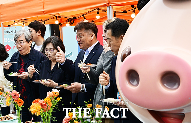 [더팩트ㅣ배정한 기자] 손세희 한돈자조금관리위원회 위원장(왼쪽 세번째)이 11일 오전 서울 성동구 성수동 XYZ 서울에서 열린 ‘2025 SUPER 한돈 페스타 팝업스토어’ 개막식에 참석해 내빈 및 홍보대사들과 함께 시식을 하고 있다.