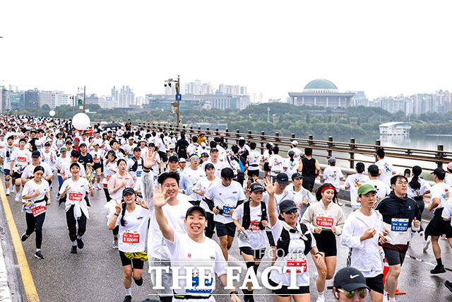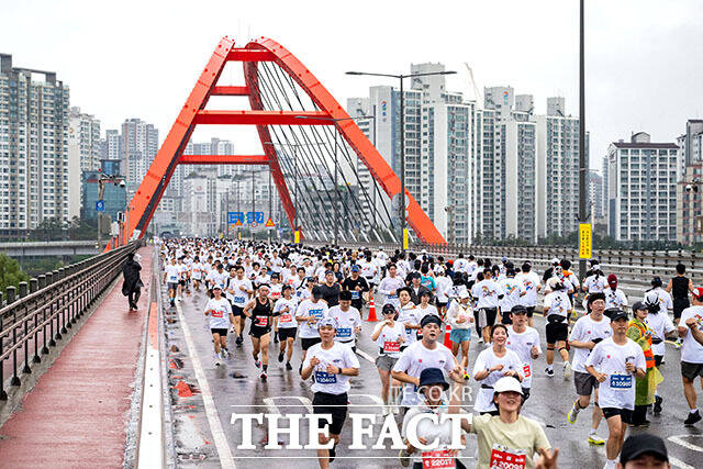 한강과 도심을 배경으로 펼쳐진 대규모 러닝 행렬은 비가 내리는 날씨 속에서도 축제의 열기를 이어갔다.