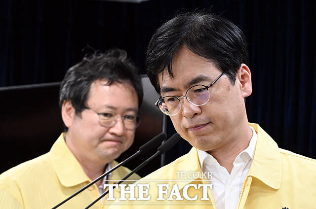 [더팩트ㅣ임영무 기자] 김민재 행정안전부 차관(오른쪽)과 이재용 국가정보자원관리원장이 13일 오후 서울 종로구 정부서울청사에서 열린 국가정보자원관리원 화재 복구 상황 브리핑에 참석하고 있다.