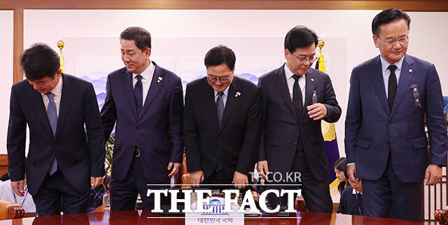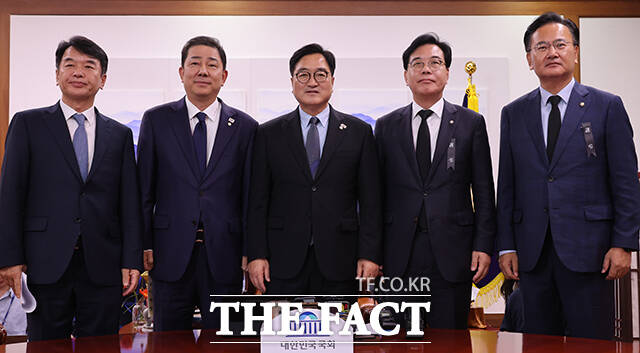 [더팩트ㅣ국회=배정한 기자] 우원식 국회의장과 여야 원내대표가 13일 오후 서울 여의도 국회에서 열린 국회의장 주재 여야 원내대표 회동에 참석해 기념사진 촬영을 하고 있다. 왼쪽부터 문진석 더불어민주당 원내운영수석부대표, 김병기 원내대표, 우 의장, 송언석 국민의힘 원내대표, 유상범 원내운영수석부대표.