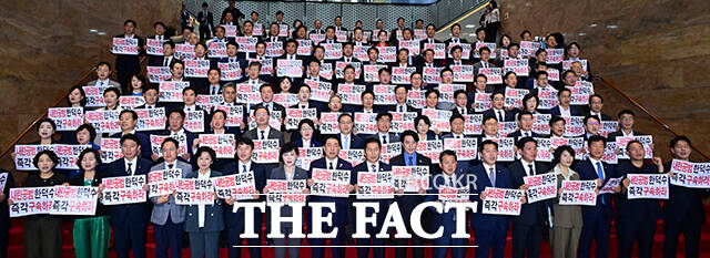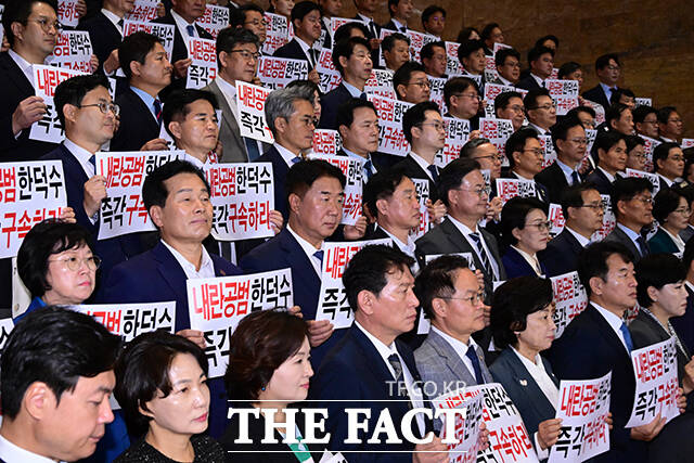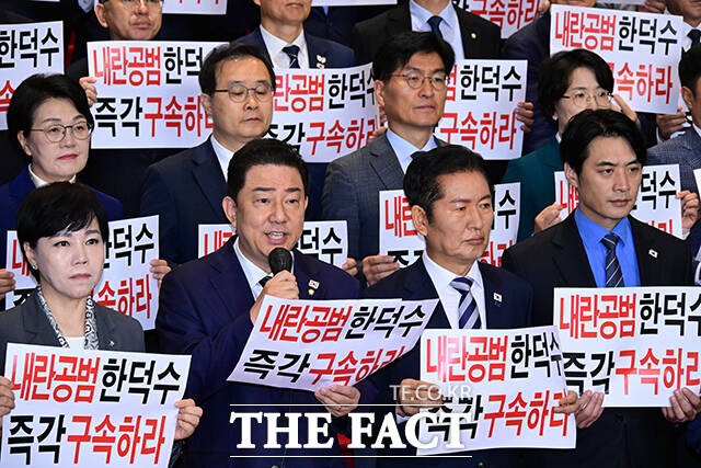 [더팩트ㅣ국회=남윤호 기자] 정청래 더불어민주당 대표를 비롯한 소속 의원들이 14일 오전 서울 여의도 국회에서 열린 한덕수 등 국무위원 내란공모 규탄 기자회견에 참석해 규탄 구호를 외치고 있다.
