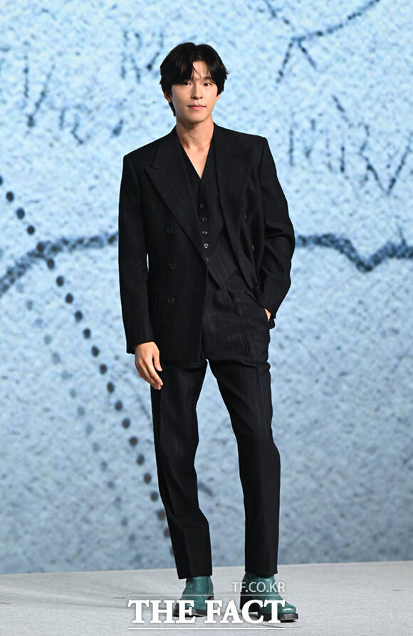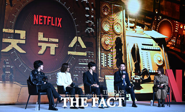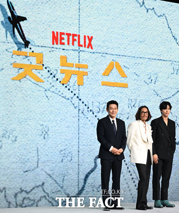 [더팩트ㅣ이새롬 기자] 배우 설경구와 류승범, 홍경(왼쪽부터)이 14일 서울 종로구 JW 메리어트 동대문 스퀘어에서 열린 넷플릭스 영화 '굿뉴스' 제작보고회에 참석해 포즈를 취하고 있다.