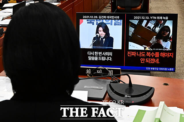 그러면서 김 여사의 허위 이력 논란이 불거진 후인 2021년 12월 26일 대국민 사과 영상, 2021년 12월 13일 인터뷰 녹취 영상이라고 적혀있는 영상을 교차로 재생하며 의혹을 부각했다.