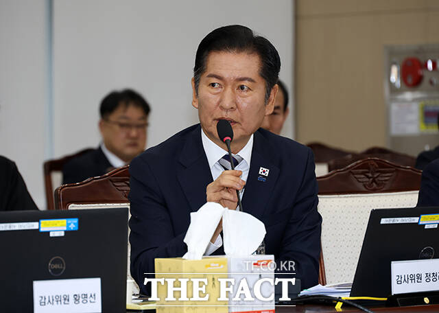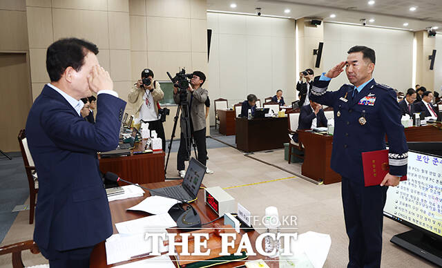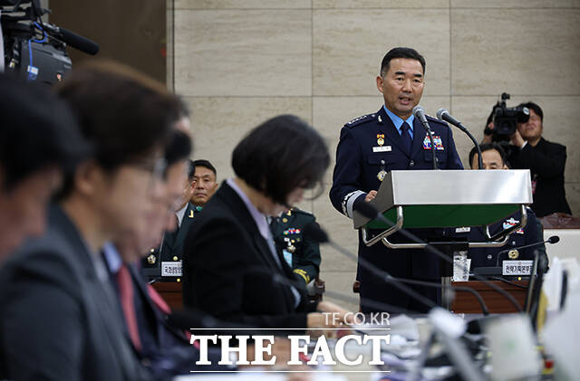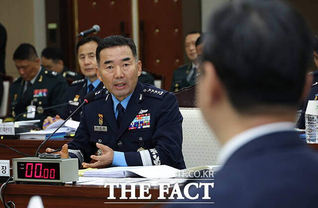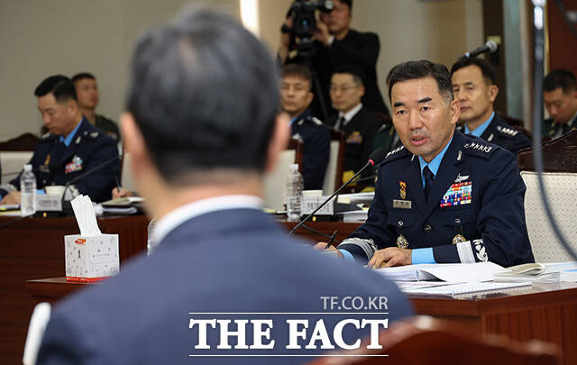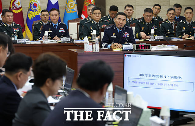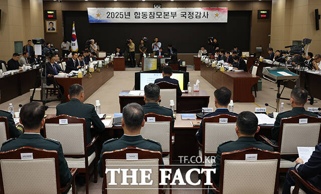 [더팩트ㅣ국회=배정한 기자] 진영승 합동참모본부 의장(가운데)이 14일 오전 서울 용산구 합동참모본부에서 열린 국회 국방위원회 국정감사에 참석해 업무보고를 하고 있다.