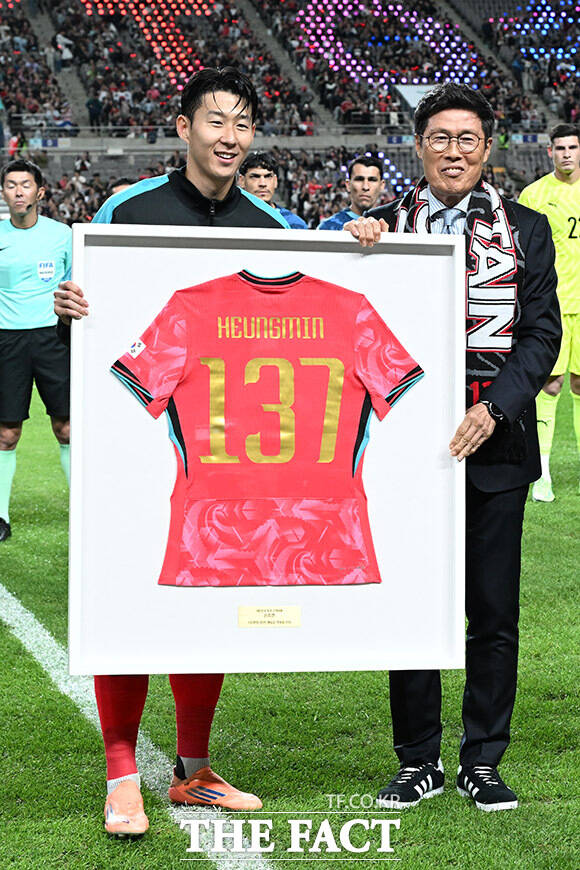 [더팩트ㅣ서울월드컵경기장=남용희 기자] 한국 남자 선수 A매치 최다 출전(137경기) 달성에 성공한 손흥민(왼쪽)이 14일 오후 서울 마포구 서울월드컵경기장에서 열린 'Legend Old & New – From Cha, To. Son' 특별 행사에서 차범근 전 감독에게 기념 유니폼을 전달 받은 뒤 기념촬영을 하고 있다.
