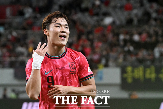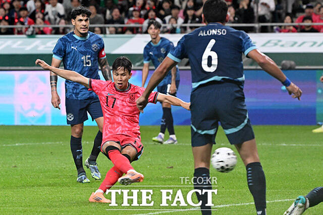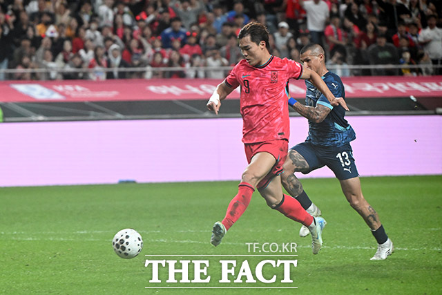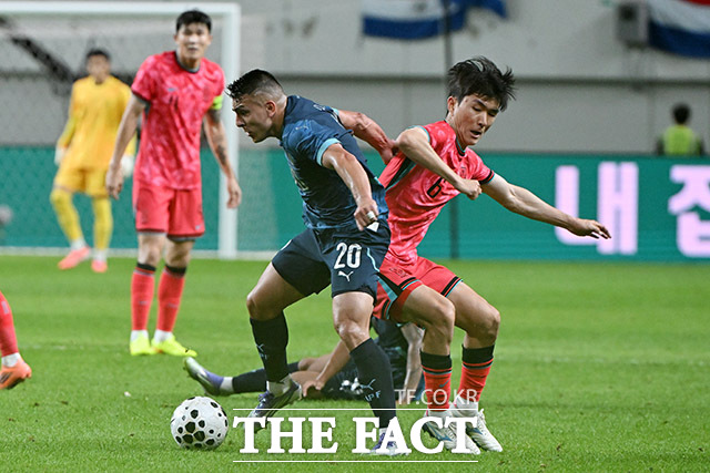 [더팩트ㅣ서울월드컵경기장=남용희 기자] 홍명보 감독이 이끄는 한국 축구대표팀이 14일 오후 서울 상암월드컵경기장에서 열린 파라과이와의 평가전에서 2대 0으로 이겼다. 축구 대표팀은 이날 경기에서 엄지성, 오현규의 득점을 앞세워 승리했다.