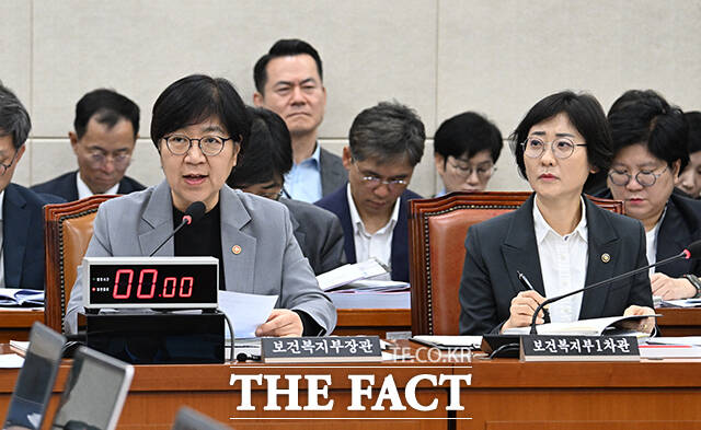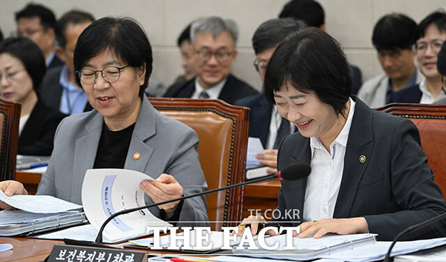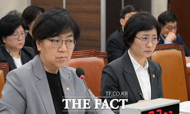 [더팩트ㅣ국회=박헌우 기자] 정은경 보건복지부 장관(왼쪽)과 이스란 보건복지부 제1차관이 15일 오전 서울 여의도 국회에서 열린 보건복지위원회의 보건복지부 등에 대한 국정감사에 참석해 질의를 듣고 있다.
