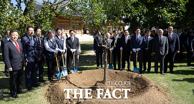 우원식 국회의장과 5단체 대표들이 '국회 사회적 대화 공동선언식'에 앞서 기념식수를 하고 있다.