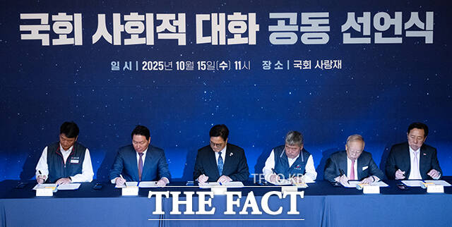 [더팩트ㅣ국회=박헌우 기자] 양경수 민주노총 위원장과 최태원 대한상공회의소 회장, 우원식 국회의장, 김동명 한국노총 위원장, 손경식 한국경영자총협회 회장, 김기문 중기중앙회장(왼쪽부터)이 15일 오전 서울 여의도 국회 사랑재에서 열린 '국회 사회적 대화 공동선언식'에 참석해 공동선언문에 서명 후 기념촬영을 하고 있다.